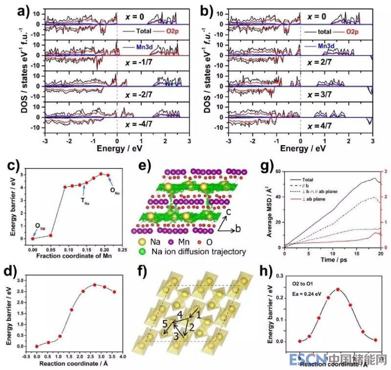 圖5.不同充電(x≤0, a)和放電(x≥2/7, b)狀態(tài)Na(4/7+x)[Mn6/7(□Mn)1/7]O2的電子態(tài)密度(DOS)圖。為原始Na4/7[Mn6/7(□Mn)1/7]O2中錳離子沿z坐標(biāo)計(jì)算得到的總能(c),計(jì)算得到的錳離子從Na2/7[Mn6/7(□Mn)1/7]O2過(guò)渡金屬層遷移至鈉層的遷移勢(shì)壘(d)。計(jì)算得到的鈉離子概率密度圖(e)和可能的鈉離子遷移路線(f),在2000K條件下Na4/7[Mn6/7(□Mn)1/7]O2中鈉離子沿不同路徑計(jì)算得到的投影均方位移(g),鈉離子沿O1→O2路徑的遷移勢(shì)壘(h)。