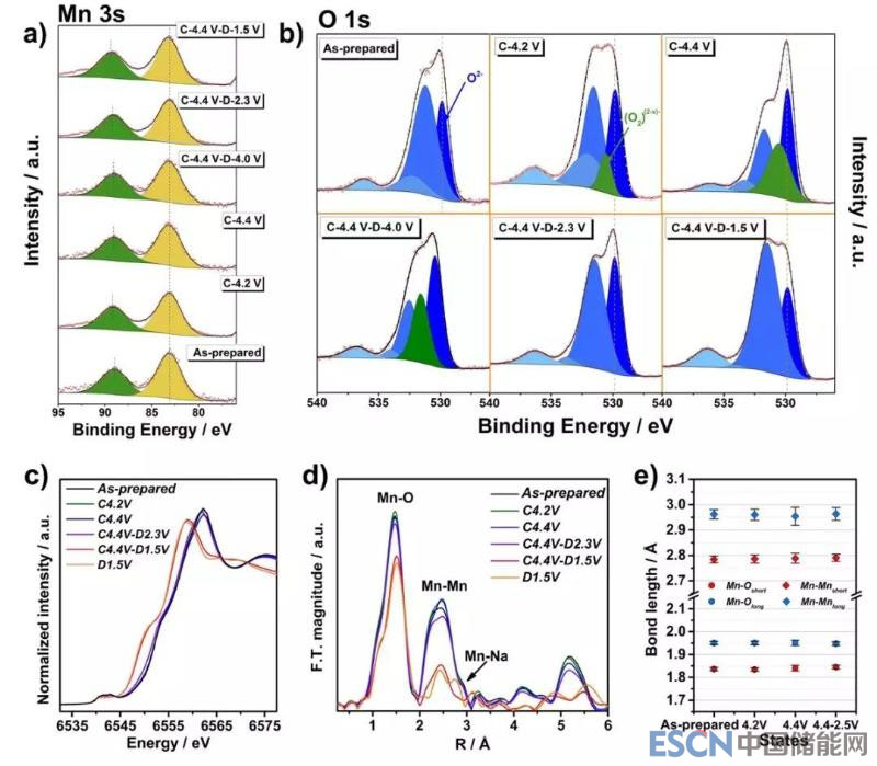 這說(shuō)明在鈉離子脫出過(guò)程中,錳離子的化學(xué)價(jià)態(tài)并沒(méi)有發(fā)生明顯改變,只是其配位環(huán)境發(fā)生了輕微的改變。對(duì)擴(kuò)展X射線吸收精細(xì)結(jié)構(gòu)(EXAFS)譜進(jìn)行擬合,結(jié)果表明樣品在2.3-4.4V之間Mn-O鍵和Mn-Mn鍵的鍵長(zhǎng)并沒(méi)有明顯的改變。除了極微小的鍵長(zhǎng)變化,圖 4d顯示Mn-O,Mn-Mn以及Mn-Na鍵對(duì)應(yīng)的傅里葉變換幅值也有微小變化,這表明Mn的配位環(huán)境發(fā)生了輕微的改變。