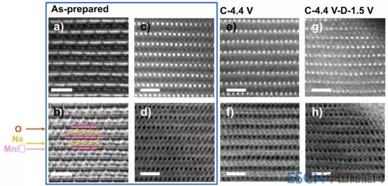 圖3. (a-c, e和g)分別為新制備N(xiāo)a4/7[Mn6/7(□Mn)1/7]O2樣品、充電至4.4V和充電至4.4V再放電至1.5V樣品的HAADF圖像,(b-d, f和h)分別為與(a-c, e和g)狀態(tài)相對(duì)應(yīng)的ABF圖像。
