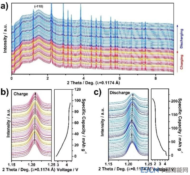圖 2. (a)在鈉離子脫出和嵌入過(guò)程中Na4/7[Mn6/7(□Mn)1/7]O2的原位同步輻射XRD (λ=0.1174 ?)譜圖。(b)和(c)分別為充電和放電過(guò)程中(-110)峰演化的放大圖。