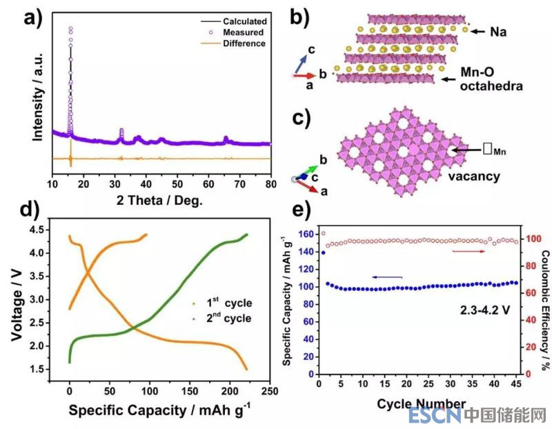 圖1. 新制備N(xiāo)a4/7[Mn6/7(□Mn)1/7]O2材料的XRD譜圖(a)及其分別沿著(b)和垂直(c)于(-110)方向的晶體結(jié)構(gòu)示意圖。(d)和(f)分別為作為鈉離子電池電極材料在1.5-4.4V間充放電的電壓曲線和在2.3-4.2V間充放電的循環(huán)性能。電流密度均為20 mAg-1。