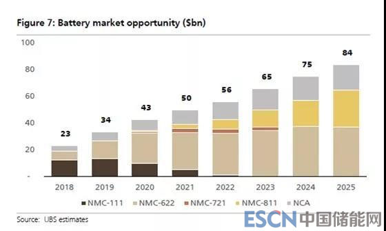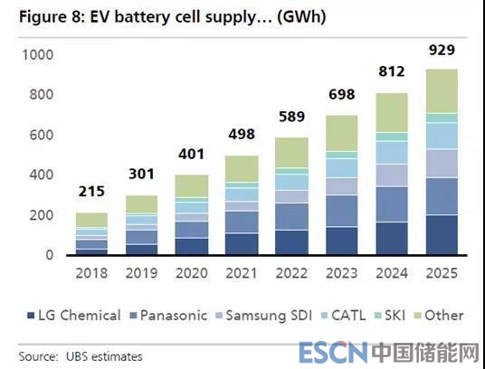 報告指出,未來幾年內電芯的產能將與需求保持同步增長,UBS預計到2021年,松下、LG 化學、三星SDI、寧德時代,以及SKI的產能都將超過50GWh,是絕對的增量來源。