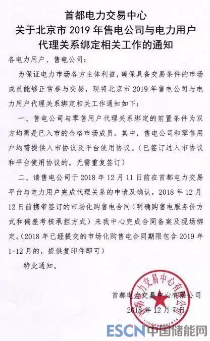 通知要求,已入市的合格售電公司需要在2018年12月11日前在首都電力交易平臺與電力用戶完成代理關(guān)系的申請及確認,2018年12月12日前攜帶簽訂的市場化購售電合同(明確購售電服務(wù)價方式和偏差考核承擔方式)完成合同備案及現(xiàn)場綁定。