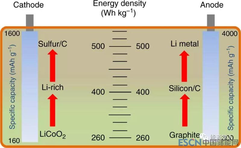圖1.基于不同正極和負(fù)極材料的LIB的比能量密度