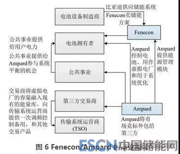 Fenecon/Ampard 開(kāi)展的虛擬電廠模式,將Ampard 的能源管理模塊與 Pro Hybrid 儲(chǔ)能系統(tǒng)集成起來(lái),使其可以在用戶(hù)側(cè)被用作虛擬電廠。用戶(hù)為了增加自發(fā)自用而購(gòu)買(mǎi)儲(chǔ)能系統(tǒng),Ampard 利用他們的能源管理系統(tǒng)(Ampard Energy Manager)將這些系統(tǒng)管理起來(lái),為這些儲(chǔ)能系統(tǒng)增加虛擬電廠的功能提供一次調(diào)頻控制和備用等服務(wù)。Fenecon/Ampard 的商業(yè)模式見(jiàn)圖6。
