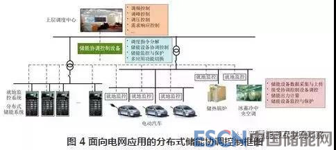 目前,國(guó)際上的分布式儲(chǔ)能協(xié)調(diào)控制設(shè)備研發(fā)也處在剛剛起步的過(guò)程,如德國(guó)能源供應(yīng)公司SENEC.IES,目前有 2000 個(gè)用戶(hù)參與到他們的Economic Grid計(jì)劃中,家庭用戶(hù)安裝“雙向能源管理系統(tǒng)”(簡(jiǎn)稱(chēng) BEMI),每 15 min 儲(chǔ)存用戶(hù)用電數(shù)據(jù),記錄用戶(hù)用電習(xí)慣,當(dāng)電價(jià)發(fā)生變動(dòng)時(shí),BEMI 通過(guò)控制分布式儲(chǔ)能系統(tǒng)來(lái)調(diào)控用電時(shí)間和用電量。目前國(guó)內(nèi)尚沒(méi)有分布式儲(chǔ)能相關(guān)產(chǎn)品,主要是借用微網(wǎng)控制器實(shí)現(xiàn)類(lèi)似功能,然而微網(wǎng)控制器多用于本地控制,很少涉及到廣域多點(diǎn)調(diào)度相關(guān)功能,同時(shí)微網(wǎng)控制器缺乏對(duì)電池儲(chǔ)能系統(tǒng)在線(xiàn)檢測(cè)、充放電優(yōu)化控制和保護(hù)的相關(guān)功能,難以實(shí)現(xiàn)對(duì)于分布式儲(chǔ)能系統(tǒng)的全面控制和優(yōu)化。伴隨配網(wǎng)側(cè)分布式儲(chǔ)能的快速發(fā)展,面向電網(wǎng)的儲(chǔ)能資源匯聚應(yīng)用將包含電池儲(chǔ)能設(shè)備、通過(guò) V2G并網(wǎng)的電動(dòng)汽車(chē)、儲(chǔ)熱鍋爐、冰蓄冷中央空調(diào)等分布式儲(chǔ)能設(shè)備,通過(guò)多設(shè)備間的協(xié)調(diào)控制,參與電網(wǎng)調(diào)峰、調(diào)頻等應(yīng)用,如圖4所示。在這個(gè)過(guò)程中,儲(chǔ)能系統(tǒng)的協(xié)調(diào)控制設(shè)備在上層調(diào)度和各分散的分布式儲(chǔ)能資源間起到調(diào)度指令分解、儲(chǔ)能設(shè)備協(xié)調(diào)控制、儲(chǔ)能監(jiān)控與保護(hù)、多應(yīng)用功能切換等功能。