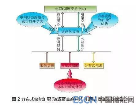 總體而言,已有研究大多針對(duì)集中式大容量的儲(chǔ)能系統(tǒng),而對(duì)于分布式儲(chǔ)能參與電網(wǎng)輔助服務(wù)的協(xié)同控制技術(shù)研究還較少。如何構(gòu)建規(guī)?;植际絻?chǔ)能匯聚效應(yīng)的動(dòng)態(tài)仿真模型,協(xié)調(diào)控制多點(diǎn)布局的分布式儲(chǔ)能以及柔性負(fù)荷,亟需開(kāi)展相關(guān)內(nèi)容的深入研究與應(yīng)用。有研究定義了負(fù)荷聚合商概念,因此進(jìn)一步可以擴(kuò)展到儲(chǔ)能參與需求響應(yīng)和提供輔助服務(wù)中,將會(huì)出現(xiàn)“資源聚合商”,未來(lái)資源聚合商將匯聚若干分布式用戶(hù)儲(chǔ)能參與電力市場(chǎng)交易,基本框架如圖 2 所示。