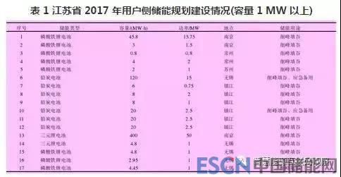 此外,在用戶(hù)側(cè)規(guī)劃儲(chǔ)能設(shè)備,不存在布點(diǎn)問(wèn)題;并且因?yàn)槲覈?guó)目前實(shí)行分時(shí)電價(jià)和針對(duì)工商業(yè)用戶(hù)的兩部制電價(jià)政策,所以用戶(hù)側(cè)分布式儲(chǔ)能的引入多從經(jīng)濟(jì)性角度出發(fā),以減少電費(fèi)或最大化收益為目標(biāo)開(kāi)展儲(chǔ)能配置研究。江蘇 2017年用戶(hù)側(cè)分布式儲(chǔ)能規(guī)劃建設(shè)情況如表 1 所示。