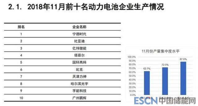 2018年1-11月 中國汽車動力電池產(chǎn)量簡報動力電池種類 產(chǎn)量(GWh) 占比 三元電池34.456.2%磷酸鐵鋰電池25.842.1%其它材料電池 11.7% 總計61.2100% 11月份,部分企業(yè)年底沖量速度迅速提升,對集中度水平有一定稀釋,較10月份均有所下降。動力電池產(chǎn)業(yè)產(chǎn)量排名前三名企業(yè)共計生產(chǎn)5.1GWh,占比62.7%;前五名企業(yè)共計生產(chǎn)5.9GWh,占比72.5%,前十名企業(yè)共計生產(chǎn)7.2GWh,占比87.6%。