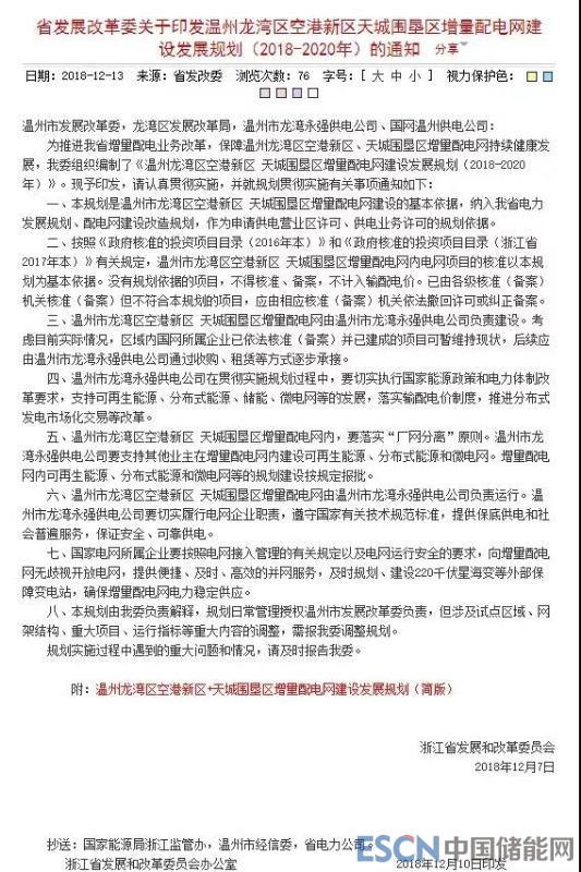 中國儲能網(wǎng)訊:日前,浙江省發(fā)改委發(fā)布了《溫州龍灣區(qū)空港新區(qū) 天城圍墾區(qū)增量配電網(wǎng)建設發(fā)展規(guī)劃(2018-2020年)的通知》,通知中稱,規(guī)劃是溫州市龍灣區(qū)空港新區(qū)、天城圍墾區(qū)增量配電網(wǎng)建設的基本依據(jù),納入浙江省電力發(fā)展規(guī)劃、配電網(wǎng)建設改造規(guī)劃,作為申請供電營業(yè)區(qū)許可、供電業(yè)務許可的規(guī)劃依據(jù)。溫州市龍灣區(qū)空港新區(qū)、天城圍墾區(qū)增量配電網(wǎng)由溫州市龍灣永強供電公司負責建設??紤]目前實際情況,區(qū)域內(nèi)國網(wǎng)所屬企業(yè)已依法核準(備案)并已建成的項目可暫維持現(xiàn)狀,后續(xù)應由溫州市龍灣永強供電公司通過收購、租賃等方式逐步承接。