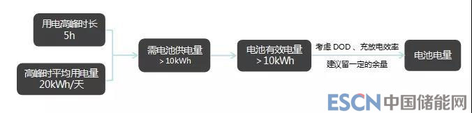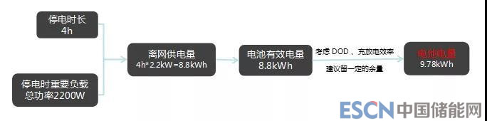 其中離網(wǎng)時(shí)的用電總功率和離網(wǎng)預(yù)計(jì)時(shí)間是最關(guān)鍵的參數(shù)。以停電預(yù)計(jì)的最長(zhǎng)時(shí)間4小時(shí)來(lái)計(jì)算,其設(shè)計(jì)思路可參考:
