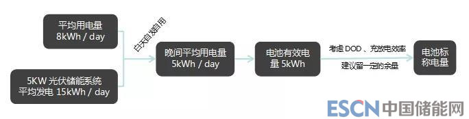 最理想狀態(tài)是,光伏+儲(chǔ)能系統(tǒng)能夠完全覆蓋家庭用電。但是這種情況很難實(shí)現(xiàn)。所以我們綜合考慮投入成本和用電情況,可以選擇根據(jù)家庭平均日用電量(kWh)來(lái)選擇電池的容量(默認(rèn)光伏系統(tǒng)能量充足)。設(shè)計(jì)邏輯如下 :