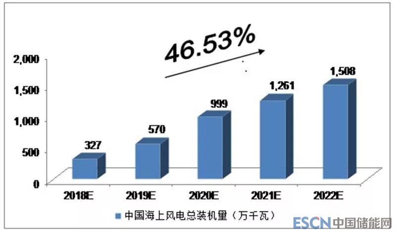 而中國的海上風(fēng)電在近幾年一直保持穩(wěn)定增長,據(jù)相關(guān)機(jī)構(gòu)預(yù)測(cè),我國海上風(fēng)電總裝機(jī)在2018-2022年的年均復(fù)合增長率約為46.53%,即2022年將達(dá)到1508萬千瓦。加之海上風(fēng)電未來的成本下降幅度,對(duì)應(yīng)遠(yuǎn)期海上風(fēng)電市場(chǎng)總空間有望超萬億。