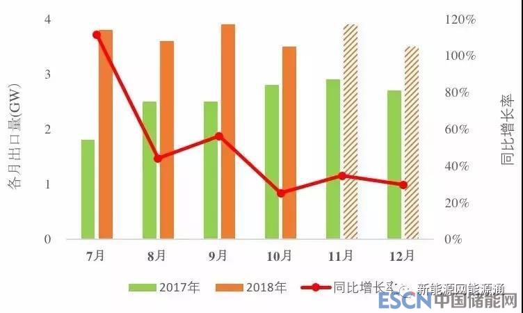 圖:2017、2018年下半年各月組件出口量及增長(zhǎng)率