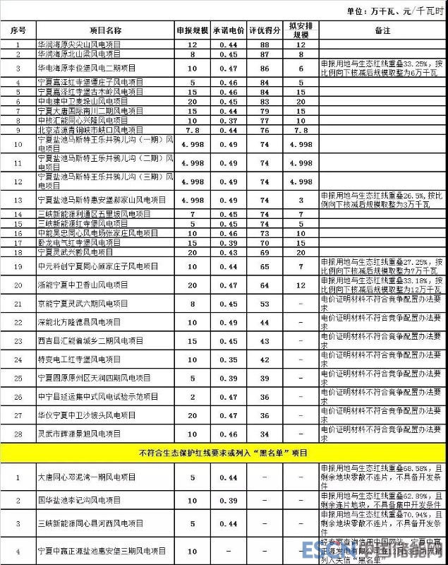 寧夏風電基地2018年度風電項目競爭配置評優(yōu)結(jié)果公示表