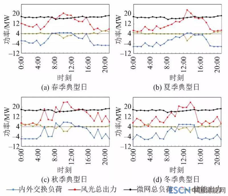 圖9和圖10為傳統(tǒng)運營模式和一體化運營模式下,春、夏、秋、冬四季典型日微網(wǎng)的運行情況(儲能出力負值表示充電,內(nèi)外交換負荷負值表示外。