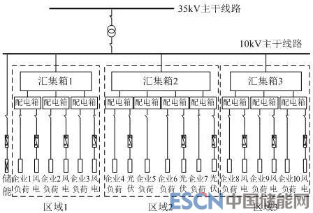 微網(wǎng)分為3塊區(qū)域,均為大工業(yè)用戶,電壓等級為10kV,最大負荷為11.13MW。項目壽命周期為20年,設(shè)備綜合造價及相關(guān)成本參考當?shù)貥藴?基準折現(xiàn)率取7%。傳統(tǒng)運營模式下微網(wǎng)項目總投資約1.62億元,其中源側(cè)約14500萬元,網(wǎng)側(cè)投約310萬元,儲側(cè)約900萬元,信息化平臺(能量管理系統(tǒng))約500萬元;一體化運營模式總投資約1.68億元,其中源網(wǎng)儲側(cè)投資變化不大,信息化平臺(大數(shù)據(jù)云計算平臺、微平衡市場交易系統(tǒng)、能量管理系統(tǒng))約1100萬元。圖7為微網(wǎng)接線方案示意圖。