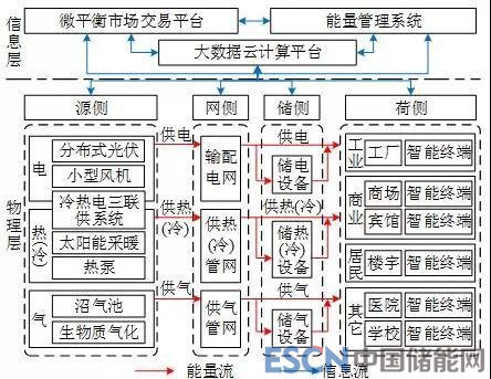 微網(wǎng)是一種靠近用戶側(cè)的微型綜合能源系統(tǒng),涵蓋天然氣、太陽能、風能等一次能源及電力二次能源,涉及電、熱、氣多種能源輸配網(wǎng)絡(luò)和負荷需求、儲能、控制和保護設(shè)備及信息化平臺,以電能為核心,通過多能互聯(lián)、信息能量耦合及市場經(jīng)濟引導,實現(xiàn)多能“供-需-儲”協(xié)調(diào)優(yōu)化和自平衡。圖1為典型園區(qū)微網(wǎng)的示意圖,源側(cè)包括分布式光伏、小型風機等電源,燃氣三聯(lián)供系統(tǒng),熱泵等熱源,沼氣池等氣源;儲側(cè)包括蓄電池、儲熱罐、蓄冷空調(diào)等儲電、儲熱(冷)和儲氣設(shè)備;網(wǎng)側(cè)包括電、熱(冷)、油氣等輸送網(wǎng)絡(luò);荷側(cè)涵蓋多樣化智能終端;信息層包括大數(shù)據(jù)云計算平臺、微平衡市場交易系統(tǒng)和能量管理系統(tǒng)。微網(wǎng)包含以下4方面特征: