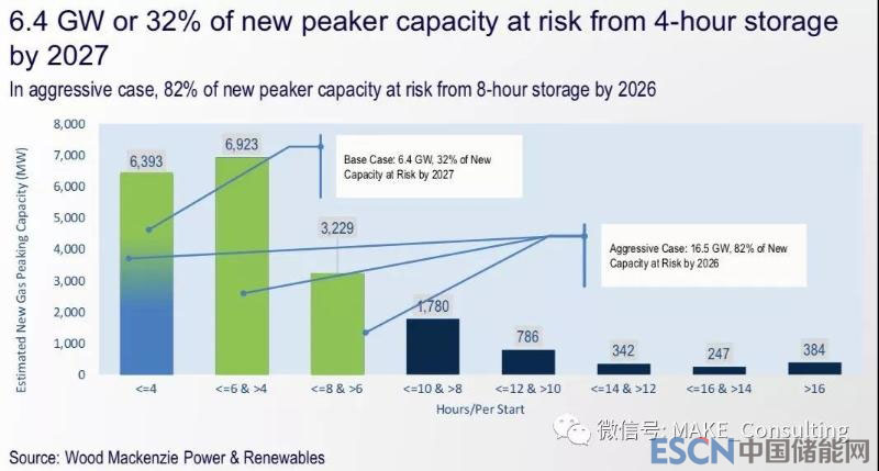這也是Manghani的第三個(gè)預(yù)測(cè)。據(jù)Wood Mackenzie電力與可再生能源事業(yè)部預(yù)測(cè)數(shù)據(jù),至2026年,調(diào)峰電廠發(fā)電量6.4GW(約占美國所需調(diào)峰電力需求量的32%)或?qū)⒈?小時(shí)或續(xù)航時(shí)間更長(zhǎng)的儲(chǔ)能項(xiàng)目所替代。這是基于儲(chǔ)能成本每年度下降6-8%條件的保守預(yù)測(cè)。
