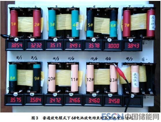 而在均衡放電實(shí)驗(yàn)中,臨近放電結(jié)束前,電壓一直處于相對最低的卻是11#電池,而不是6#電池,同樣也不是2#電池,主要原因就是均衡器的介入自動改變了每塊電池的實(shí)際放電電流,明顯降低了2#和6#電池的實(shí)際放電電流,在常規(guī)放電實(shí)驗(yàn)中,1#和7#電池的電壓一直處于最高狀態(tài),直至放電結(jié)束,顯示出這兩塊電池的容量最大。