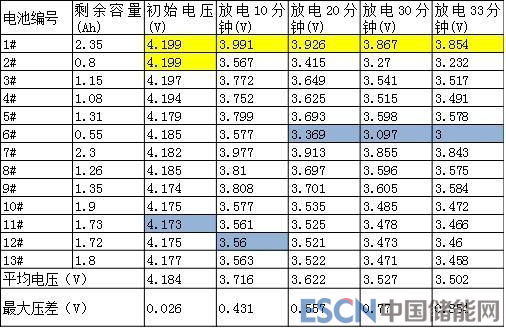 從放電測量數(shù)據(jù)可以看出,放電至33分鐘時(shí),6#電池到達(dá)放電截止電壓,停止放電,此時(shí),2#電池的電量也即將放完,但其他11塊電池仍具有較多的電量沒有釋放出來,放電結(jié)束時(shí)的電壓就說明了一切,特別是1#和7#電池還剩余非常多的電量沒有釋放,無法利用,這種情況特別像安裝了具有單體電池放電保護(hù)的BMS電池管理系統(tǒng)的動力電池組。