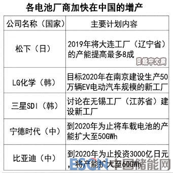 此前,全球最大的車(chē)載電池制造商寧德時(shí)代新能源科技(CATL)計(jì)劃2020年之前將車(chē)載電池的產(chǎn)能提高至2017年的4倍以上,達(dá)到50GWh。比亞迪(BYD)將在2020年之前投入超過(guò)3000億日元,將年產(chǎn)能提高至60GWh。而日本的松下最早將在2019年內(nèi)將車(chē)載電池的產(chǎn)能最大提高8成。韓國(guó)的LG化學(xué)也將于2020年在南京新建工廠。