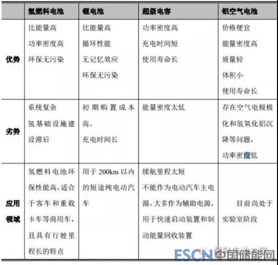 目前在交通運輸用動力源方面,主要有四種技術路線:鋰離子電池、氫燃料電池、超級電容和鋁空氣電池。其中鋰離子電池、超級電容和氫燃料電池得到廣泛的應用,而鋁空氣電池尚處于實驗室研究階段。能源補給方面,鋰離子電池、超級電容適用于純電動汽車,但是需要外部充電,而氫燃料電池汽車則需要外部氫氣加注,鋁空氣電池則需要補充鋁板和電解液。