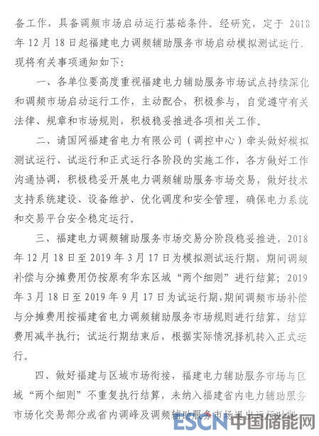 福建能監(jiān)辦日前發(fā)布了《關(guān)于福建省電力調(diào)頻輔助服務(wù)市場(chǎng)啟動(dòng)運(yùn)行有關(guān)工作的通知(閩監(jiān)能市場(chǎng)〔2018〕139號(hào))》、關(guān)于印發(fā)《福建省電力調(diào)頻輔助服務(wù)市場(chǎng)交易規(guī)則(試行)》的通知(閩監(jiān)能市場(chǎng)〔2018〕140號(hào)),定于2018年12月18日起福建電力調(diào)頻輔助服務(wù)市場(chǎng)啟動(dòng)模擬測(cè)試運(yùn)行。2018年12月18日至2019年3月17日為模擬測(cè)試運(yùn)行,期間調(diào)頻補(bǔ)償與分?jǐn)傎M(fèi)用仍按原有華東區(qū)域“兩個(gè)細(xì)則”進(jìn)行結(jié)算;2019年3月18日至2019年9月17日為試運(yùn)行期,期間調(diào)頻市場(chǎng)補(bǔ)償與分?jǐn)傎M(fèi)用按福建省電力調(diào)頻輔助服務(wù)市場(chǎng)規(guī)則進(jìn)行結(jié)算,結(jié)算費(fèi)用減半執(zhí)行;試運(yùn)行期結(jié)束后,根據(jù)實(shí)際情況擇機(jī)轉(zhuǎn)入正式運(yùn)行。