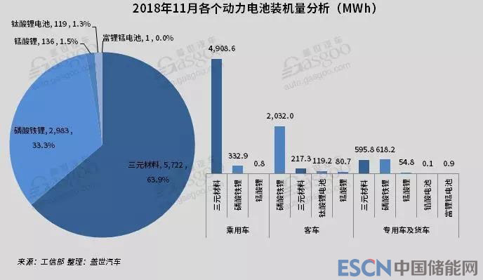 11月三元材料電池裝機(jī)量為5.72GWh,環(huán)比增長42.27%。其中乘用車裝機(jī)量占三元材料總裝機(jī)量的85.8%,環(huán)比增長30.8%,乘用車裝機(jī)量占比較上月下降7.5%。三元材料電池裝機(jī)量占11月總裝機(jī)量的63.9%,較上個(gè)月份額下降了3.9%。