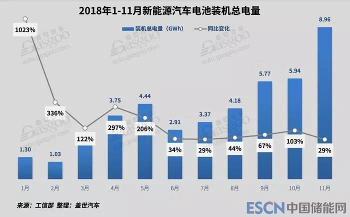根據(jù)蓋世汽車研究院統(tǒng)計(jì),11月動力電池裝機(jī)量為8.96GWh,同比增長28.8%,環(huán)比增長50.9%。1-11月累計(jì)裝機(jī)量為43.7GWh,累計(jì)同比增長76.8%。