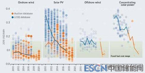 2017年投產的海上風電項目的全球加權平均電費為0.14美元/千瓦時,而光熱(CSP)則為0.22美元/千瓦時,然而,根據(jù)2016年和2017年的拍賣結果—對于將在2020年及以后投入使用的光熱(CSP)和海上風電項目,預示著著大階段變化,光熱(CSP)和海上風電的成本分別將降至0.06美元/千瓦時和0.10美元/千瓦時。最近和預期的成本降低都表明光伏和風電技術的具有較高的緊縮率,即使它們在商業(yè)上已經非常成熟,它們仍然具備降低成本的巨大潛力,基于項目和拍賣數(shù)據(jù),2010~2020年的海上風電的學習率為14%,陸上風電為21%,光熱(CSP)為30%和光伏發(fā)電為35%。