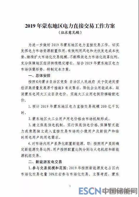 中國儲能網(wǎng)訊:為進一步做好2019年蒙東地區(qū)電力直接交易工作,切實發(fā)揮電力市場資源配置工作,有效利用風(fēng)電和光伏發(fā)電成本優(yōu)勢,繼續(xù)擴大市場化交易規(guī)模,不斷釋放電力市場化改革紅利,充分保障地區(qū)經(jīng)濟持續(xù)穩(wěn)定增長,近日,蒙東電力交易中心發(fā)布了關(guān)于轉(zhuǎn)發(fā)《內(nèi)蒙古自治區(qū)工信廳關(guān)于征求<2019年蒙東地區(qū)電力直接交易工作方案>意見的函》(以下簡稱《意見》)。