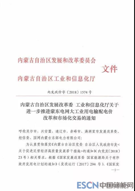 另外,《內(nèi)蒙古自治區(qū)發(fā)展改革委 內(nèi)蒙古自治區(qū)工信廳關(guān)于進一步推進蒙東電網(wǎng)大工業(yè)用電輸配電價改革和市場化交易的通知》也于同日下發(fā),規(guī)定自2019年1月1日起蒙東地區(qū)大工業(yè)用電全部進入電力交易市場,停止執(zhí)行蒙東電網(wǎng)大工業(yè)目錄銷售電價。
