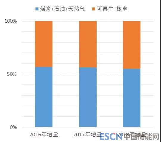 能源消耗增加如此之快,如果增量部分能夠由清潔的非化石能源來(lái)提供,也不必太過(guò)擔(dān)憂(yōu)。近三年中國(guó)能源消費(fèi)結(jié)構(gòu)確有改善,煤炭消費(fèi)比重從2016年的62%下降至2018年的59%左右,降低約3個(gè)百分點(diǎn)。但是旺盛的能源需求之下,增量里仍有超過(guò)一半是化石能源。(如圖 5所示)