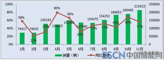 高工產(chǎn)業(yè)研究院(GGII)通過發(fā)布的《新能源汽車產(chǎn)業(yè)鏈數(shù)據(jù)庫》統(tǒng)計顯示,2018年11月全球新能源乘用車銷售約21.6萬輛,同比增長57%。
