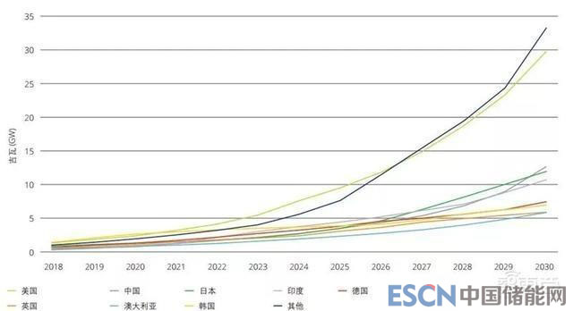 ▲2018-2030年全球各國累計(jì)儲能部署