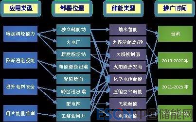 4.應用階段。將不同類型儲能的推廣應用分為四個階段,即“當前”、“2019-2020年”、“2021-2025年”、“2026-2030年”。其中,抽水蓄能和化學電池儲能在現(xiàn)階段已開始推廣應用;下一步可開展大規(guī)模儲熱和太陽能熱發(fā)電技術的應用推廣;在“十四五”期間,新型壓縮空氣和飛輪儲能的應用有望突破;而在2025年以后,大規(guī)模制氫和電磁儲能有望獲得大規(guī)模應用。