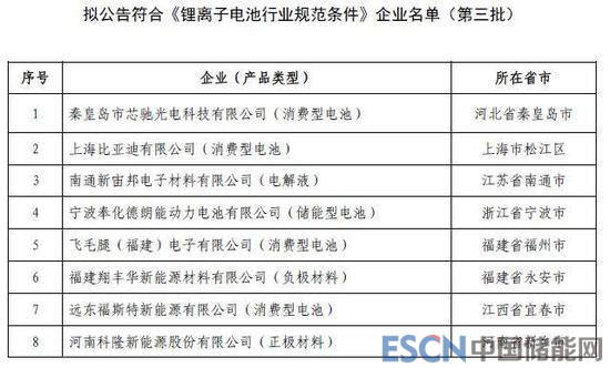 同在1月2日,工業(yè)和信息化部發(fā)布第69號公告,根據(jù)根據(jù)《鋰離子電池行業(yè)規(guī)范條件》(工業(yè)和信息化部公告2015年第57號)及《鋰離子電池行業(yè)規(guī)范公告管理暫行辦法》(工信部電子〔2015〕452號),對第三批符合《鋰離子電池行業(yè)規(guī)范條件》企業(yè)名單進行公示。