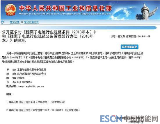 國家工業(yè)和信息化部電子信息司1月2日在其官網(wǎng)表示,為進一步加強鋰離子電池行業(yè)管理,推動產(chǎn)業(yè)加快轉(zhuǎn)型升級,工業(yè)和信息化部(電子信息司)組織修訂完成了《鋰離子電池行業(yè)規(guī)范條件(2018年本)》和《鋰離子電池行業(yè)規(guī)范公告管理暫行辦法(2018年本)》(以下簡稱“辦法”),現(xiàn)公開征求意見。如有意見或建議,請于2019年1月9日前通過傳真或電子郵件形式反饋至工業(yè)和信息化部電子信息司。該信息在行業(yè)內(nèi)引起了廣泛關(guān)注。