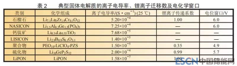 近幾年來(lái),為了進(jìn)一步提高鋰電池的比能量和安全性,國(guó)內(nèi)掀起了固態(tài)鋰電池研究的熱潮,其核心技術(shù)是高穩(wěn)定高電導(dǎo)率的固體電解質(zhì)材料和固體電解質(zhì)與電極材料的界面控制技術(shù)。固態(tài)鋰電池與傳統(tǒng)鋰電池工作原理相通,然而由于關(guān)鍵部件均為固態(tài),界面更加復(fù)雜,界面相容性直接影響固態(tài)電池性能。固體電解質(zhì)主要包括聚合物、氧化物和硫化物三類。各種固體電解質(zhì)性能對(duì)比如表2所示。目前來(lái)看,日本以豐田為代表,體系以硫化物固體電解質(zhì)為主,同時(shí)研制的雙極性固態(tài)電池平均電壓為14.4V,預(yù)計(jì)于2022年推出搭載固態(tài)電池的首款電動(dòng)汽車,技術(shù)水平國(guó)際領(lǐng)先;韓國(guó)以硫化物、無(wú)機(jī)/有機(jī)復(fù)合物為主,三星橫濱研究院研制出2Ah硫化物固態(tài)電池,可獲得200Wh/kg和500Wh/L的比能量,處于小試階段;法國(guó)和加拿大以PEO基聚合物為主,已具備小規(guī)模生產(chǎn)能力;美國(guó)Sakti3(Dyson)等的研究重點(diǎn)是LiPON基超薄氧化物固態(tài)電池,但目前處于實(shí)驗(yàn)室階段;國(guó)內(nèi)百花齊放,有機(jī)/無(wú)機(jī)復(fù)合固體電解質(zhì)實(shí)用化推進(jìn)較快,特別是贛鋒鋰業(yè)在國(guó)內(nèi)率先制備出容量4~10Ah的軟包裝全固態(tài)鋰電池,比能量最高達(dá)到286Wh/kg(628Wh/L),千次循環(huán)容量保持率為87.6%,投資2.4億建設(shè)第一代固態(tài)鋰電池研發(fā)中試生產(chǎn)線。