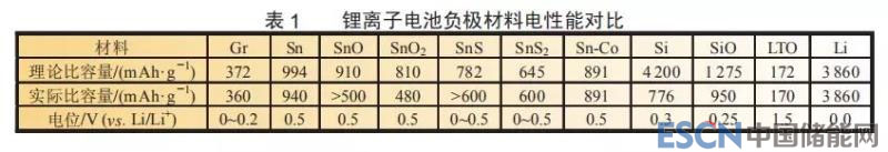 石墨材料的快速崛起得益于電解液和石墨材料的技術(shù)創(chuàng)新。石墨材料主要可以分為人造石墨和天然石墨兩類,中國(guó)鋰離子電池負(fù)極材料產(chǎn)業(yè)化研究是從人造石墨開(kāi)始的。其中,中間相碳微球(MCMB)材料具有高振實(shí)密度和低比表面積的優(yōu)點(diǎn),從而減少了首次充電過(guò)程中SEI膜的形成、降低了不可逆容量,因此MCMB被廣泛應(yīng)用。但是其生產(chǎn)溫度高達(dá)2800℃,因此成本一直居高不下。而天然石墨在成本上非常低廉,但是PC的共嵌入問(wèn)題影響了天然石墨的應(yīng)用,因此天然石墨需要EC含量較高的電解液或者對(duì)天然石墨的表面進(jìn)行改性處理,而且表面修飾的天然石墨是目前市場(chǎng)的主流。此外,軟碳和硬碳材料具有較高的鋰離子嵌入電位,尤其硬碳材料層間距達(dá)到0.372nm,更易于鋰離子擴(kuò)散。因此,軟碳和硬碳材料已經(jīng)被作為復(fù)合負(fù)極的一部分,用于動(dòng)力電池負(fù)極,滿足快充和低溫充電的要求。這一時(shí)期,合金負(fù)極材料也得到了廣泛的關(guān)注,例如Si和Sn材料,但是這些材料在嵌鋰過(guò)程中巨大的體積膨脹限制了它們的應(yīng)用?,F(xiàn)在,為追求更高的能量密度,Si-C材料和SiO材料開(kāi)發(fā)取得顯著進(jìn)展,中科院物理所擁有元霄結(jié)構(gòu)的碳包覆硅材料專利,中國(guó)電科十八所在國(guó)內(nèi)率先提出了SiO高溫處理穩(wěn)定化等新方法,推進(jìn)了硅基材料的技術(shù)進(jìn)步。此外,研究發(fā)現(xiàn)硅基材料在含氟溶劑電解液中循環(huán)十分穩(wěn)定,其穩(wěn)定后庫(kù)侖效率可達(dá)99.8%,部分解決了硅材料循環(huán)過(guò)程中表面狀態(tài)不穩(wěn)定的難題。在過(guò)去十余年中,國(guó)內(nèi)亦對(duì)其他金屬及化合物負(fù)極進(jìn)行了積極的研究。它們包括金屬形式的金屬負(fù)極,金屬間化合物,氧化物和含氧鹽(包括磷酸鹽和碳酸鹽、氧化釩、氧化鉬、基于TiO2的納米結(jié)構(gòu)材料),以及氟化物、硫化物、硒化物、氮化物、磷化物、銻化物等嵌鋰后發(fā)生相轉(zhuǎn)化的電極材料。此外,具有零應(yīng)變的Li4Ti5O12材料由于其電位高、具有可快充和低溫充電的優(yōu)勢(shì),取得了一定程度的應(yīng)用,可應(yīng)用于快充電池和混合動(dòng)力及48V起停電池。表1所示為各種鋰離子電池負(fù)極材料性能對(duì)比。