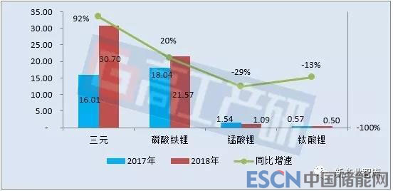 從不同電池類型來看,2018年磷酸鐵鋰電池裝機(jī)電量約21.57GWh,同比增長20%;三元電池裝機(jī)電量約30.70GWh,同比增長92%;錳酸鋰電池裝機(jī)電量約1.09GWh,同比下降29%;鈦酸鋰電池裝機(jī)電量約0.50GWh,同比下降13%。