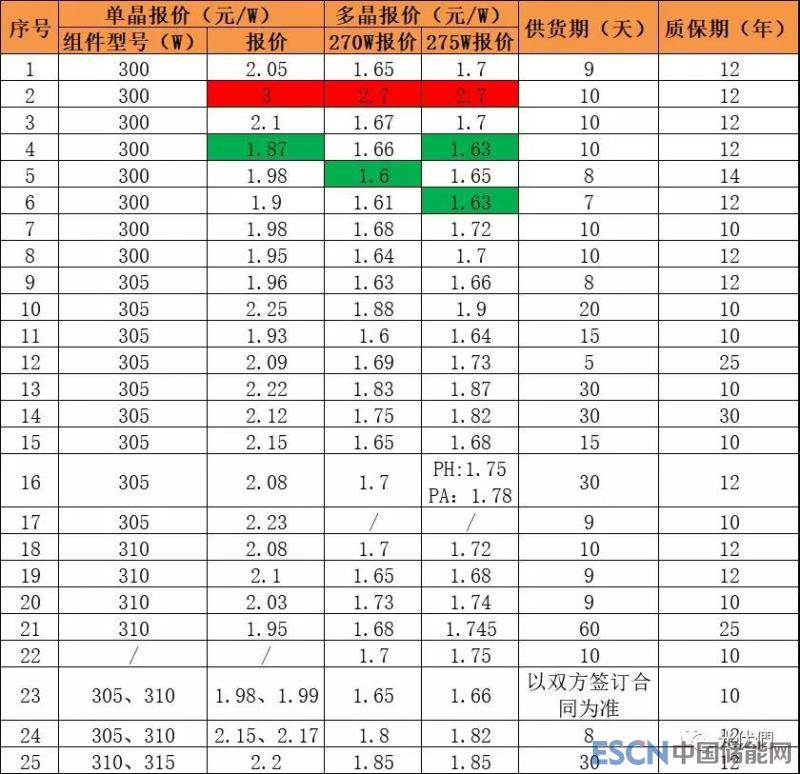 本次招標中,去除每標段最高報價和最低報價,多晶270W組件平均報價約為1.7元/W,多晶275W組件平均報價約為1.74元/W,單晶300-310W組件平均報價約為2.07元/W。