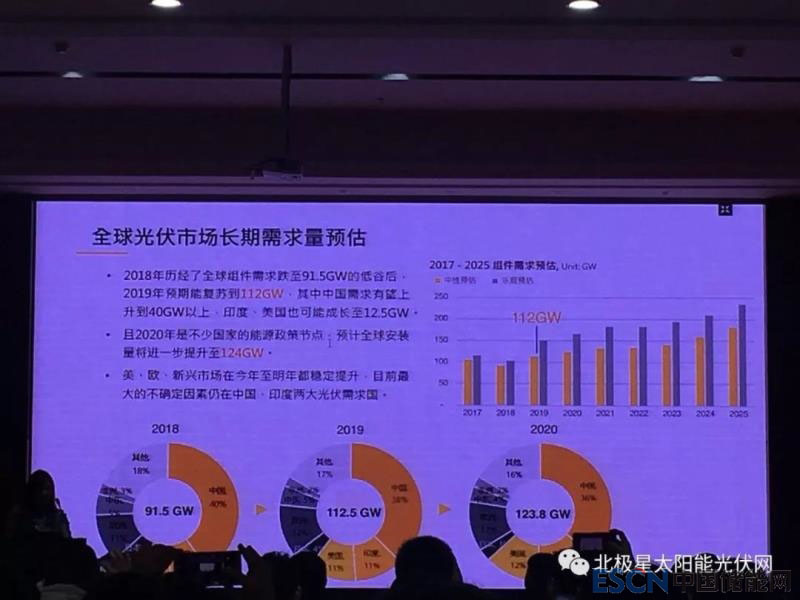 2018年歷經(jīng)了全球組件需求跌至91.5GW后,2019年預(yù)期能復(fù)蘇到112GW,其中中國需求有望升至40GW以上,印度、美國也可能成長至12.5GW。
