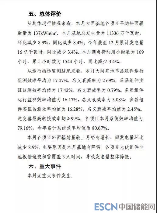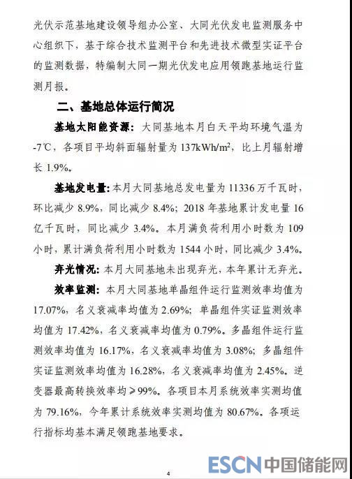 中國儲能網(wǎng)訊:在大同采煤沉陷區(qū)國家先進技術光伏示范基地建設領導組辦公室和大同光伏發(fā)電監(jiān)測服務中心組織下,中國水利水電建設工程咨詢有限公司和中國電力科學研究院基于基地綜合技術監(jiān)測平臺和先進技術微型實證平臺的監(jiān)測數(shù)據(jù),聯(lián)合編制完成了2018年12月大同光伏發(fā)電應用領跑基地(一期)運行監(jiān)測月報,現(xiàn)正式對外發(fā)布: