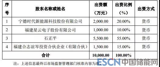 公告顯示,時(shí)代星云的注冊資本為1億元,其中,寧德時(shí)代認(rèn)繳的出資額為2000萬元,占全部注冊資本的20.00%;星云股份認(rèn)繳的出資額為1000萬元,占全部注冊資本的10.00%。具體如下: