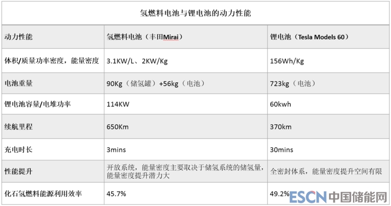 下表為氫燃料電池汽車代表豐田Mirai和動力鋰電池汽車代表特斯拉的性能對比。