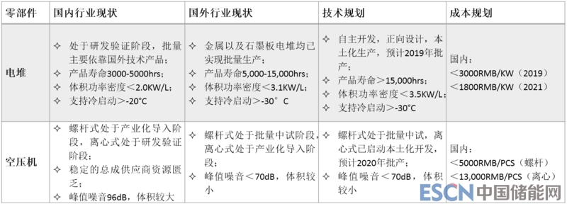 燃料電池系統(tǒng)核心零部件主要有電堆、空壓機、DC/DC、氫 氣循環(huán)泵、增濕器等,下表介紹了目前國內(nèi)外燃料電池核心零部件中,電堆與空壓機的技術(shù)發(fā)展情況。