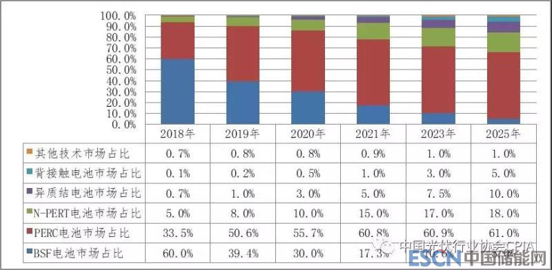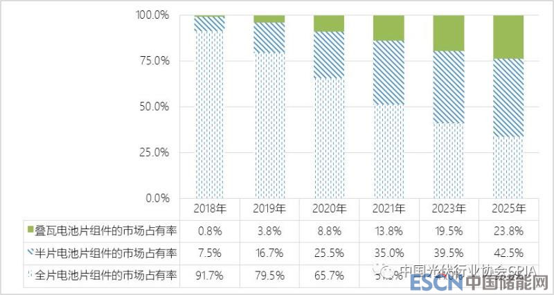 2018-2025年全片、半片和疊瓦電池組件市場占比變化趨勢