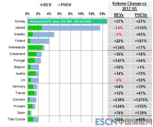 (歐洲電動(dòng)汽車市場(chǎng)份額與構(gòu)成:2018年上半年VS2017年上半年)